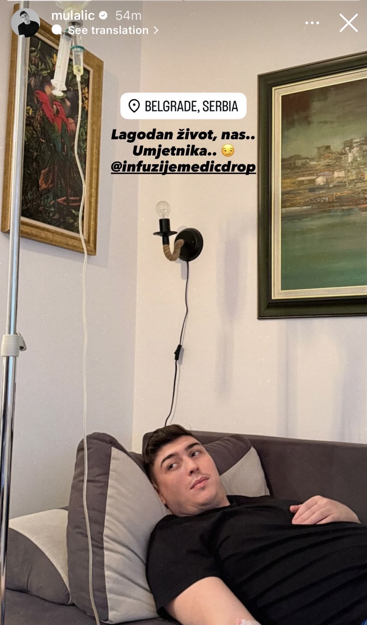 Mahir je na svom Instagram profilu podelio fotografiju na kojoj se vidi da je priključen na infuziju, uz poruku kojom je nagovestio da trenutno nije u najboljem zdravstvenom stanju.